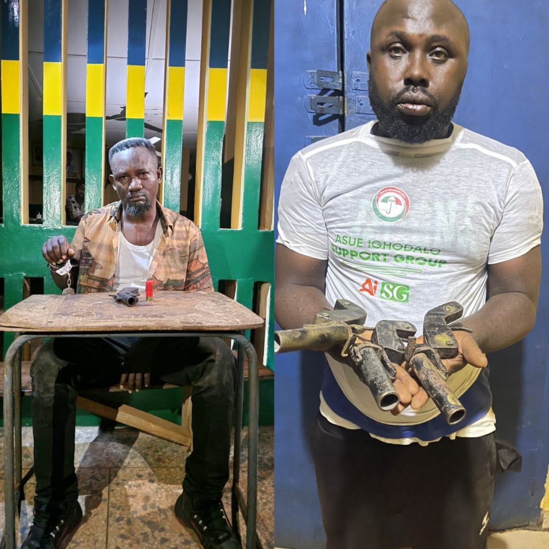 The Nigeria Police Force has made a significant breakthrough in its efforts to curb electoral violence in Edo State with the arrest of two political thugs, namely: Edwin Obanor, 43-year-old and Audu Tajudeen, a 41-year-old PDP member from Ugbogbo quarters, Igara Akoko, Edo.