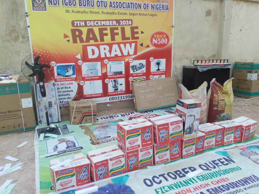 Members of Ndigbo Buru Otu Association of Nigeria on Saturday December 7,2024 went home beaming with smiles as members who participated won items including: a fridge, television, generator, washing machine, gas cookers, fan, gold watches, bags of rice, cartons of noodles, and other mouthwatering prizes via a fair raffle draw.