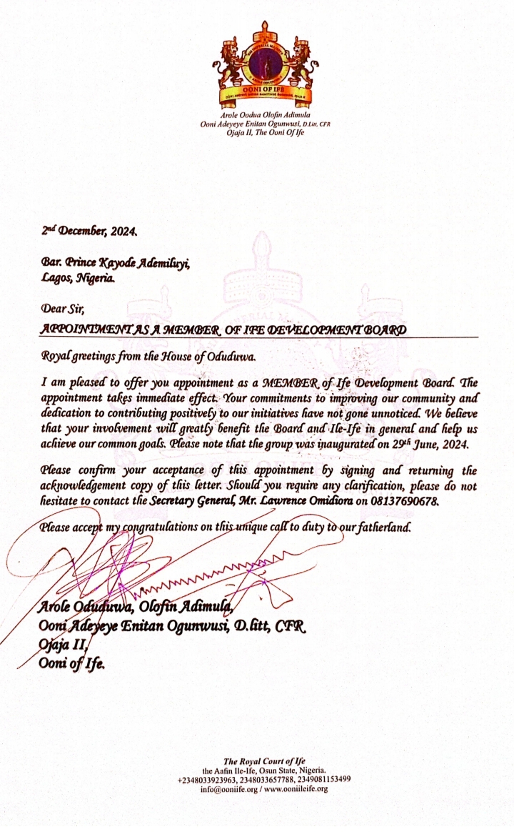 In a letter dated 2nd of December 2024,the Ooni of lfe stated that he is pleased to offer him (Bar Kayode)appointment as a member of lfe development board which takes immediate effect.