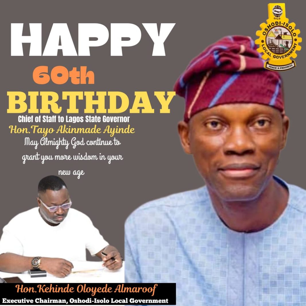 The Executive Chairman of Oshodi-Isolo local government, Otunba Kehinde Almaroof Oloyede has felicitated with the chief of staff to the Governor of Lagos State, Mr Tayo Akinmade Ayinde on his 60th birthday celebrations.
